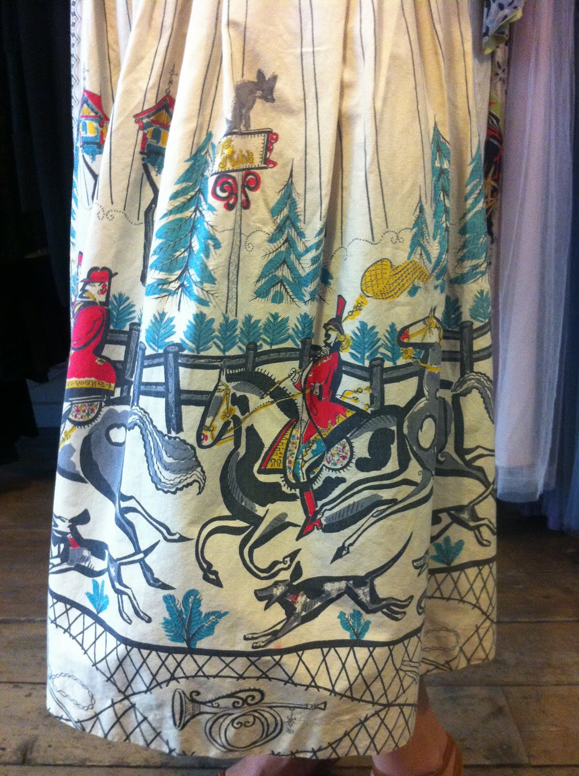 This skirt is so much fun! She looks stunning in our 1950's circle skirt with a fox-hunt print. Amazing!